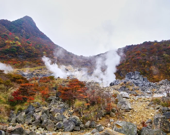 Your journey will then continue to the Owakudani Valley, an active volcanic area where, even from a distance, you can see clouds of steam rising from the smoking rocks. The air is rich with the scent of sulphur, and the warm, humid breeze serves as a reminder that the earth beneath your feet is still very much alive. Here, you can try the famous black eggs, known as kuro tamago, boiled in the bubbling hot springs and said by local folklore to add up to seven years to your life.