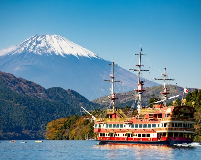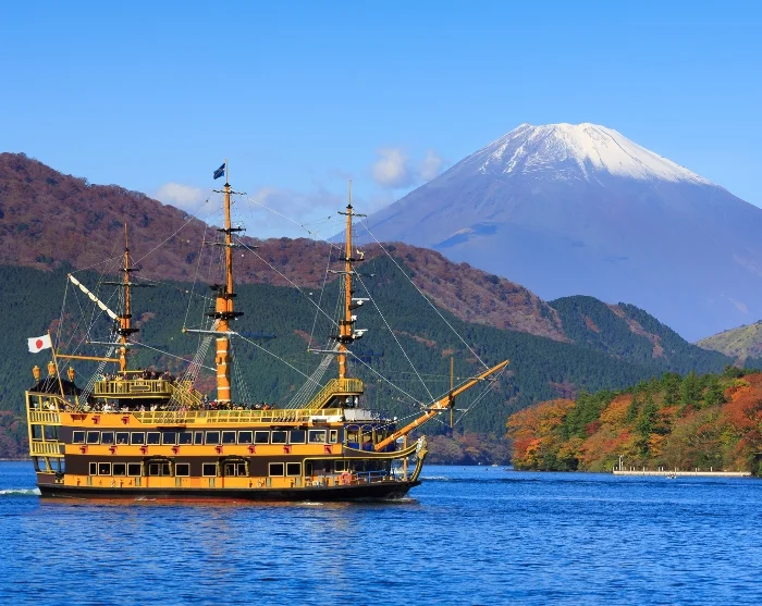 From the Owakudani Valley, you’ll take the cable car through the dramatic landscape, descending towards Togendai where the final experience of your tour awaits. Here, you’ll board one of the iconic “pirate ships” for a cruise on the deep-blue Lake Ashi, formed in a volcanic crater thousands of years ago. The ship glides peacefully across the lake’s mirror-like surface, surrounded by lush green mountainsides, and if the weather permits, Mount Fuji reveals itself on the horizon with its perfectly cone-shaped silhouette.