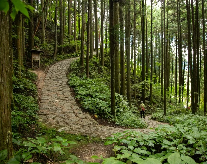 With your energy restored, you’ll be driven to Magome Pass, the highest point on the route between Magome and Tsumago. From here, your walk begins downhill through the undulating landscape, following the same paths used by samurai and travellers for centuries. You’ll wander through dense forests of towering cedar and cypress trees, pass small waterfalls, and follow old stone-paved trails. Along the way, there’s a stop at a traditional teahouse where you can rest your legs and enjoy a well-earned break in truly authentic surroundings.