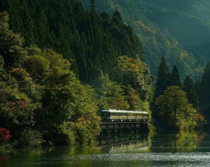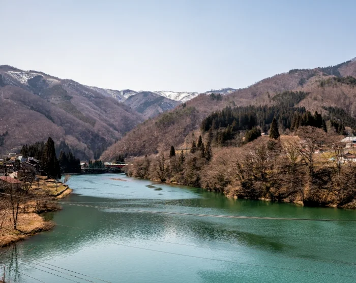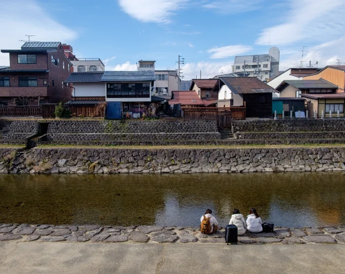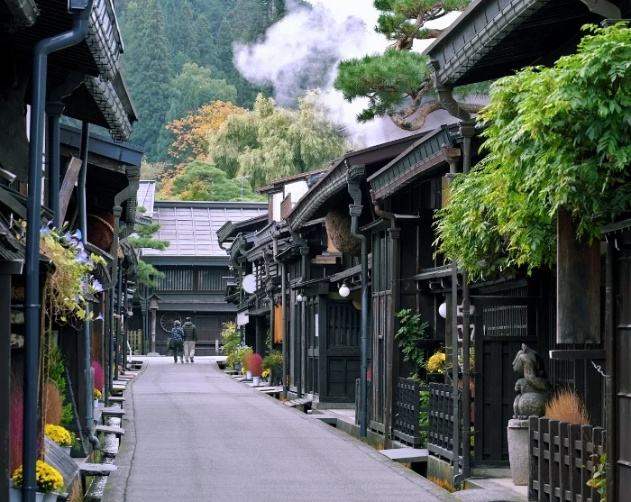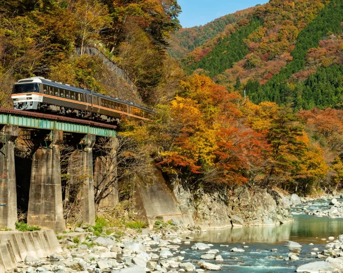 From here, your journey continues by regional train through the Japanese Alps towards Takayama in the north. Sit back and relax for almost three hours as the stunning mountain scenery rushes past your window. Along the way, you’ll pass through countless tunnels and follow the winding course of the Hida River, where each small mountain town boasts its own colourful bridge, beautifully contrasting with the surrounding hues of the season.