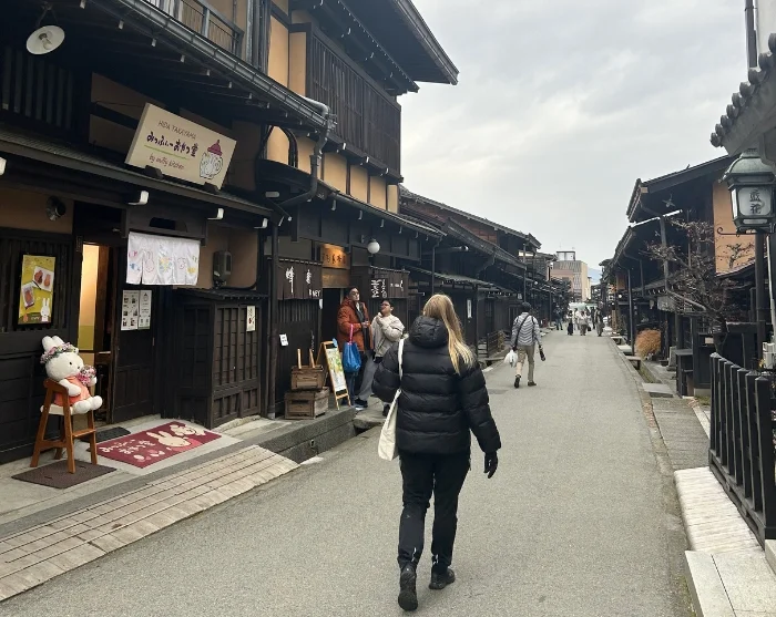 From the hotel, you’ll head away from the centre and into a residential neighbourhood, where traditional wooden houses stand alongside modern homes. Here you’ll get a glimpse of everyday life in Takayama before ascending to the city’s finest viewpoint. The path leads through peaceful surroundings, and as you climb higher, the view gradually opens up over the town. At the top, you can take a break at a small café, where your guide serves you a drink while you enjoy the panoramic views of Takayama and the surrounding mountain peaks.