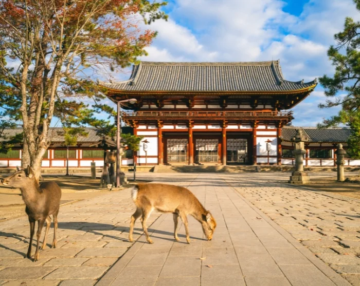 The rest of the day is free for you to spend as you wish. With Naramachi’s charming cafés nearby, it’s the perfect opportunity to stop for lunch before taking a short stroll to Nara Park later in the afternoon. The landscape opens up with lush lawns, ancient trees, and freely roaming deer moving calmly among visitors. The park is home to some of Nara’s most iconic attractions, including the impressive Todai-ji Temple with its enormous bronze statue of Buddha.