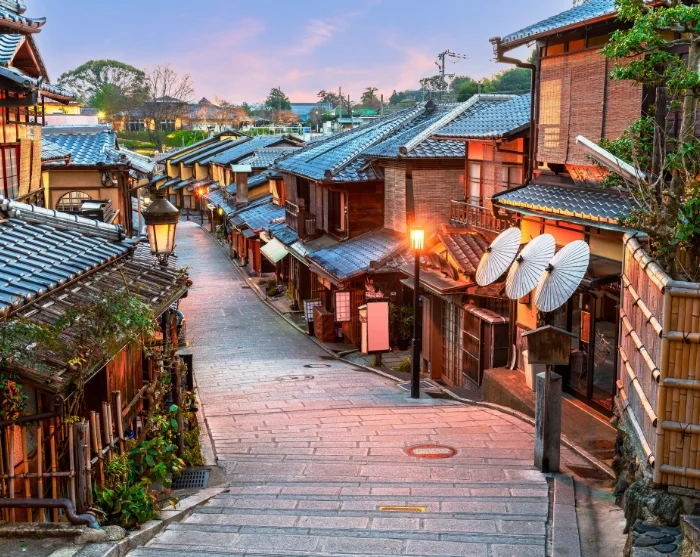 A great place to start is the Kiyomizudera Temple in eastern Kyoto, best experienced early in the morning. See how this iconic landmark seems to hover dramatically on its wooden terrace overlooking the city before continuing through the narrow streets of the delightful Higashiyama district. Here, traditional wooden houses, small shops, and teahouses create a magical atmosphere that evokes the spirit of old Japan. Visit Kōdaiji Temple with its elegant Japanese garden, and enjoy the tranquil surroundings of Yasaka Shrine and nearby Maruyama Park before ending your tour in the refined geisha quarter of Gion.