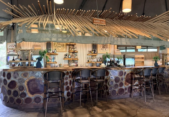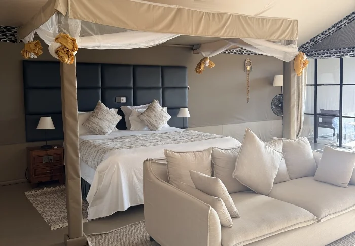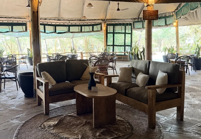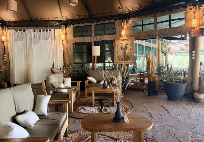 The bar and restaurant offer a cosy and welcoming atmosphere. With soft sofas, intimate nooks, and décor that mirrors the tents’ use of natural materials such as wood and stone, it’s a space that exudes warmth. The subdued colours ensure your attention remains on the stunning nature outside.