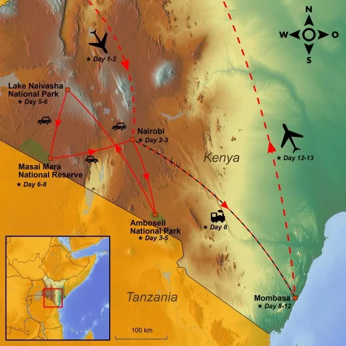 Both adventure and relaxation await you on this tour. You are going on safari in one of Kenya’s smallest national parks, Amboseli, where you have a beautiful view of snow-capped Kilimanjaro. The park is especially famous for its large herds of elephants.