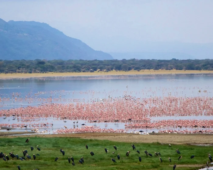 Lake Manyara itself is a soda lake, and the water level fluctuates a lot depending on whether it’s the rainy season or the dry season. Along the shore, you may be lucky enough to see large flocks of flamingos.