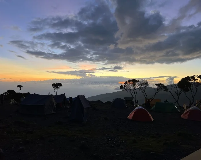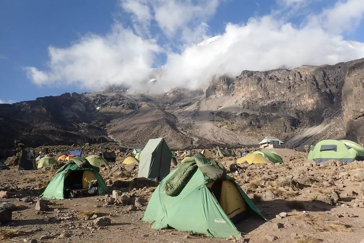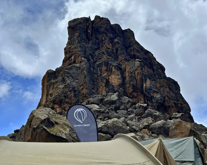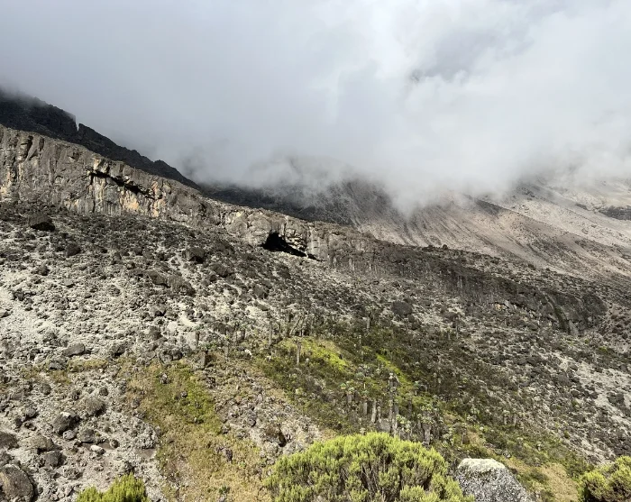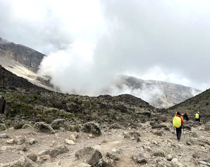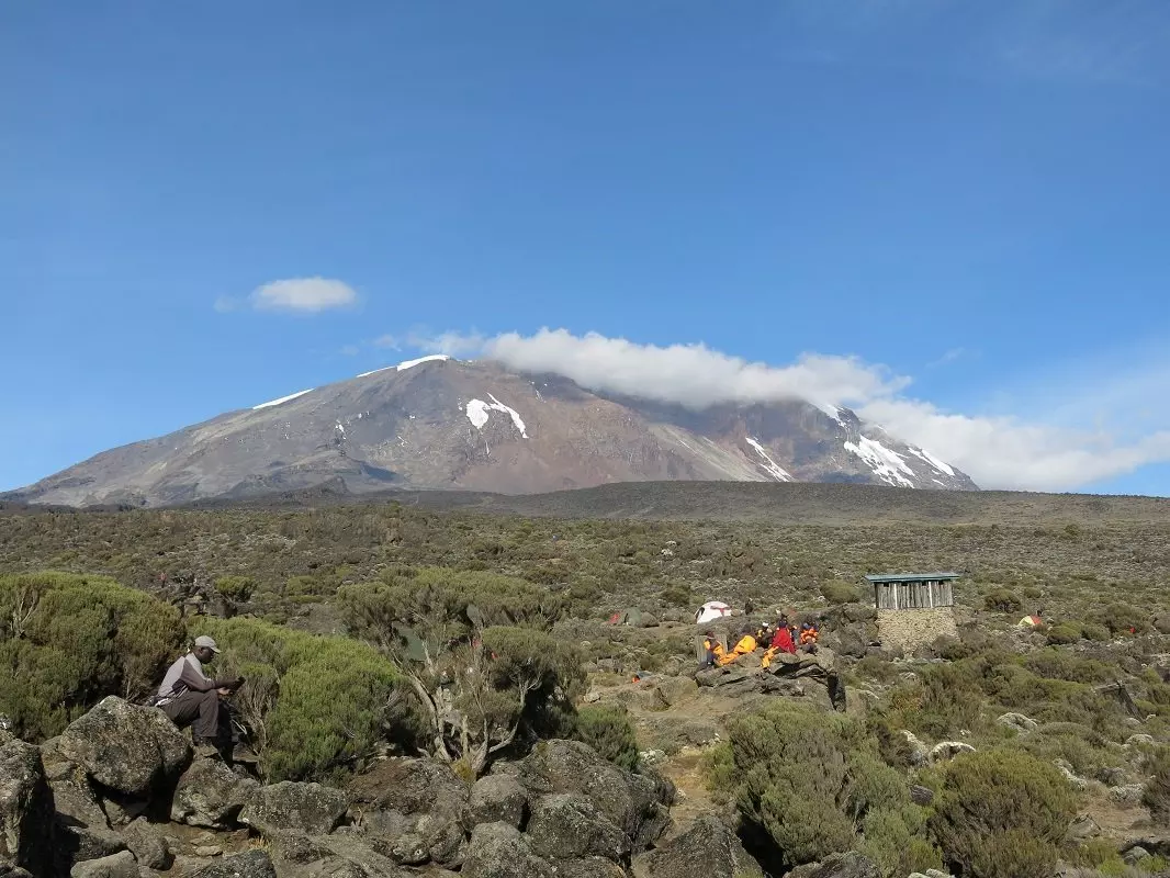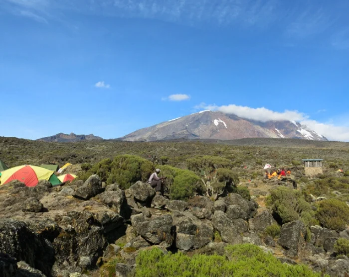 Today you will be heading east. The landscape starts to dry out, becoming more barren and stonier the higher you climb. As you continue your ascent, you can enjoy magnificent views of both Kibo and Mt. Meru, poking up above the white clouds behind you. Having followed the trail up the mountain for a couple of hours, you will reach the famous Lava Tower, which stems from Kilimanjaro’s previous incarnation as an active volcano.