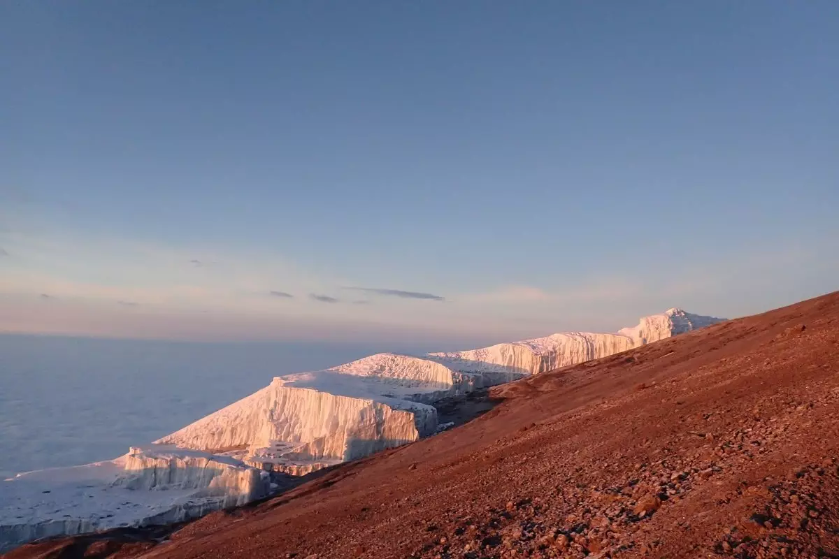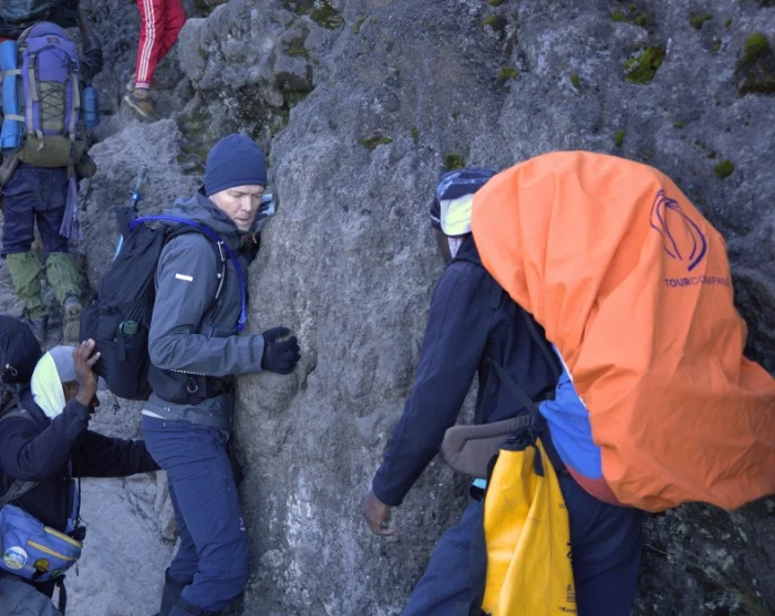 After a night at the foot of the impressive Great Barranco Wall and a solid breakfast, the time has come to climb the notorious cliff. Fortunately, it is easier than it looks … From the top, beneath Heim Glacier that hangs like a set of ice curtains across the cliff face, the full beauty of Kilimanjaro spreads out in all its glory.
