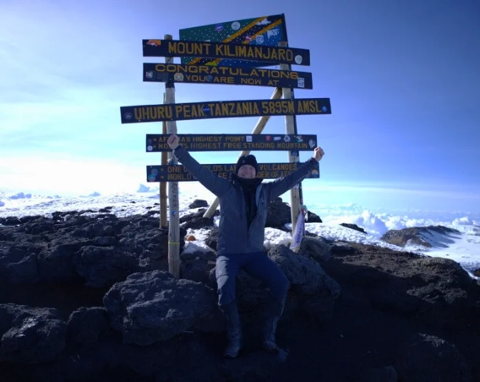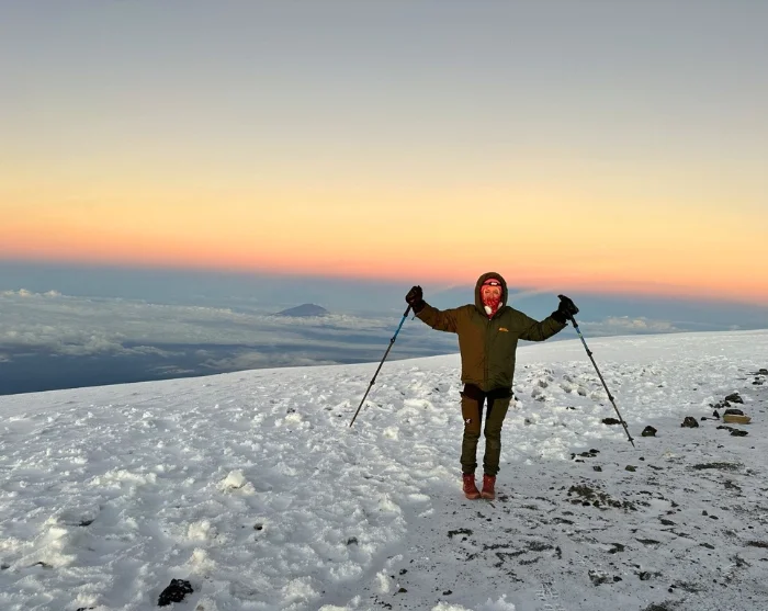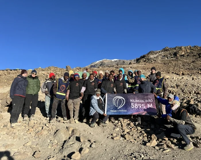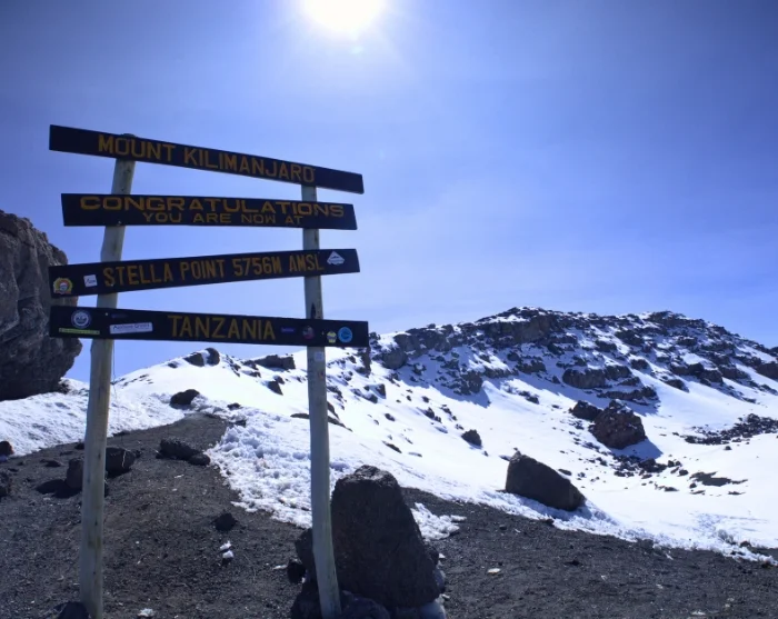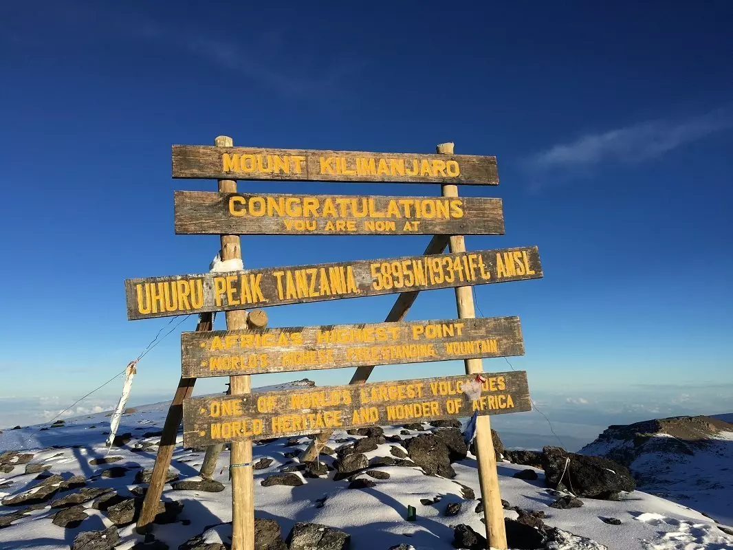 Around midnight, you will be woken up and served a snack before starting the final section of your ascent to the summit – in pitch darkness. Most people consider the difficult terrain you have to traverse on the 6-hour hike to Stella Point the biggest challenge of the entire trip. The aim is to reach Stella Point shortly after sunrise so that you can admire the sight of the blood-red sun rising gently above the horizon. You are not given long to rest, however, because otherwise it would be almost impossible to shake off the cold and fatigue and continue along the rim of the crater to Uhuru. The last stretch of the climb features an even incline. Depending on the season, you may encounter snow on the last part of the route to Uhuru Peak, which is your final goal: the top of Kilimanjaro and the highest point in Africa. Once you reach the peak at an altitude of 5,895 masl, you can give yourself a pat on the back, enjoy the magnificent view and have your picture taken in front of the Uhuru Peak sign as a lasting souvenir of your achievement.