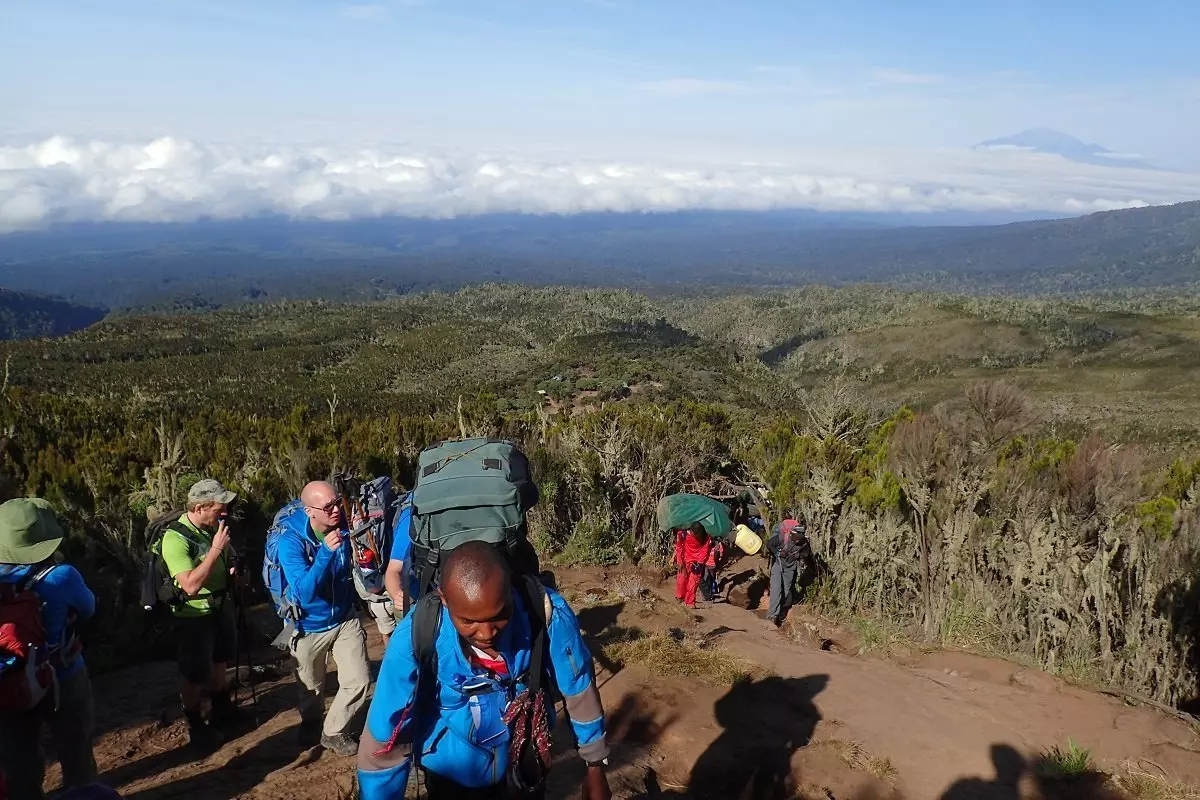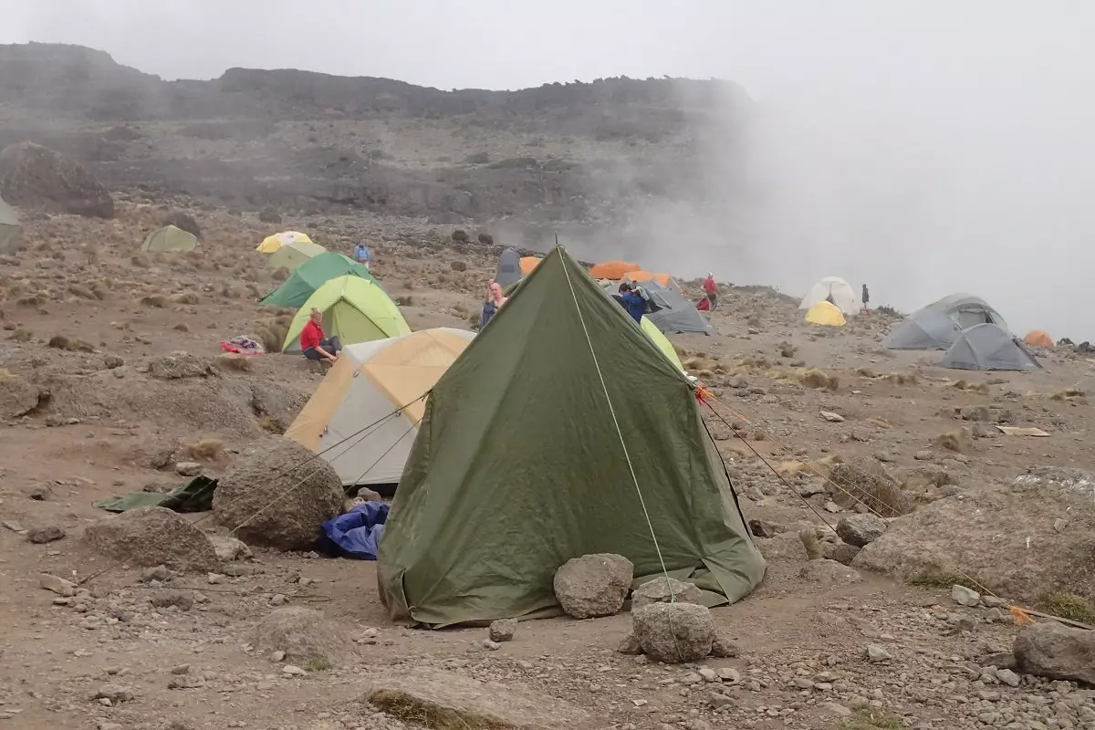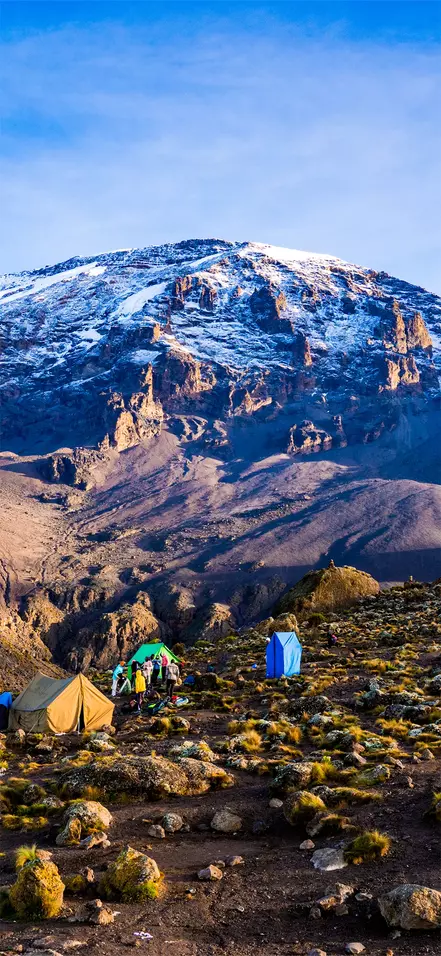 Today you will be heading east. The landscape starts to dry out, becoming more barren and stonier the higher you climb. As you continue your ascent, you can enjoy magnificent views of both Kibo and Mt. Meru, poking up above the white clouds behind you. Having followed the trail up the mountain for a couple of hours, you will reach the famous Lava Tower, which stems from Kilimanjaro’s previous incarnation as an active volcano.