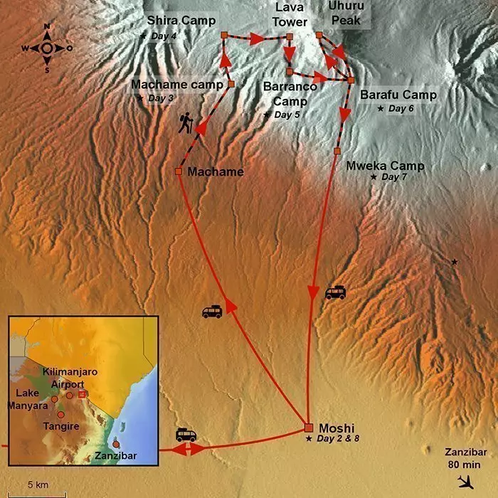Take the Shira Route to the top of Kilimanjaro. It is one of the shortest routes, making it excellent for you who are in good shape but have limited time at your disposal.