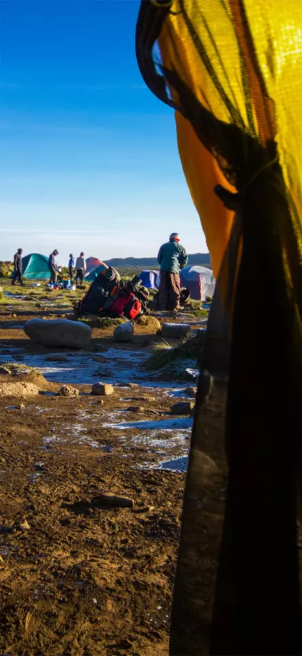 Today you will be heading east. The landscape starts to dry out, becoming more barren and stonier the higher you climb. As you continue your ascent, you can enjoy magnificent views of both Kibo and Mt. Meru, poking up above the white clouds behind you. Having followed the trail up the mountain for a couple of hours, you will reach the famous Lava Tower, which stems from Kilimanjaro’s previous incarnation as an active volcano.