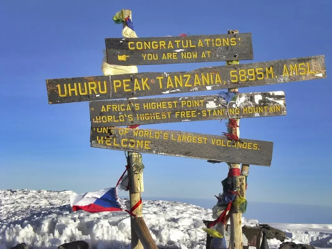 You will be woken up around midnight, and there is just time for a snack before you set off into the night. Most people find the tricky terrain here, where the trail is littered with loose stones, to be the most challenging part of the ascent. The objective is to reach Gilman’s Point at dawn, so you can make it to Uhuru – the highest point on Kibo – shortly after sunrise. You will stop briefly at Gilman’s Point to enjoy the magnificent view before continuing along the rim of the crater to Uhuru. The last stretch of the climb features an even incline. Depending on the season, you may encounter snow on the last part of the route to Uhuru Peak, which is your final goal: the top of Kilimanjaro and the highest point in Africa. Once you reach the peak at an altitude of 5,895 masl, you can give yourself a pat on the back, enjoy the magnificent view and have your picture taken in front of the Uhuru Peak sign as a lasting souvenir of your achievement.