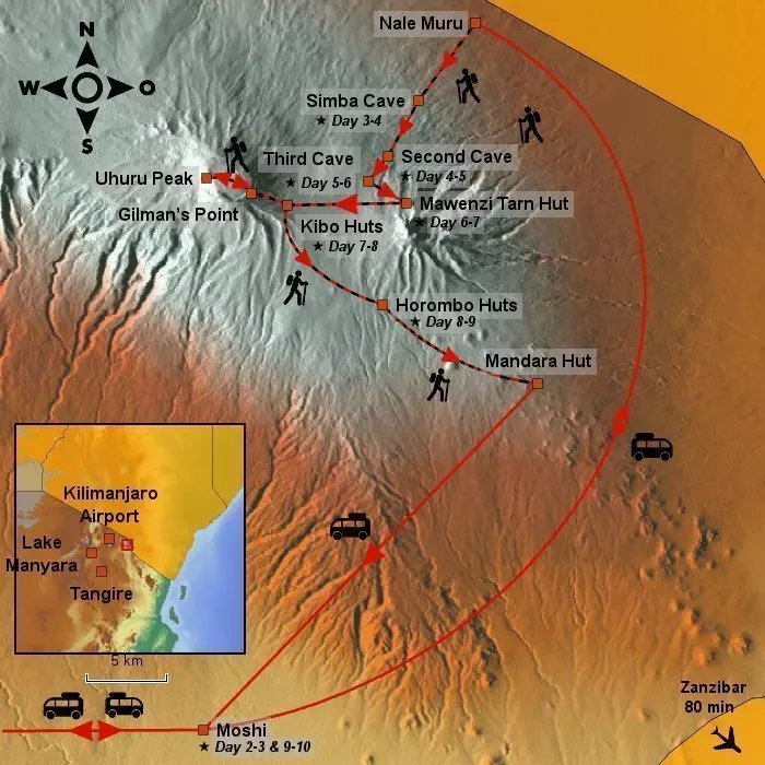 Heights: Horombo Huts: 3,695 AMSL., Marangu Gate: 1,830 AMSL., Moshi: 915 AMSL.