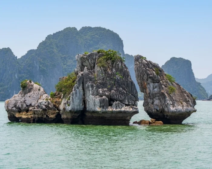 Once aboard, you’ll be welcomed with a refreshing drink as the crew gives a brief introduction to the adventure ahead. Afterwards, you can settle into your cabin and prepare for a delicious lunch featuring both Vietnamese specialities and international dishes. Meanwhile, the ship gently glides out onto the emerald waters, where you’ll be treated to views of some of Ha Long Bay’s most iconic rock formations, including Incense Burner, Dog Stone Islet, Fighting Cock Islet, and Three Coconuts Island.