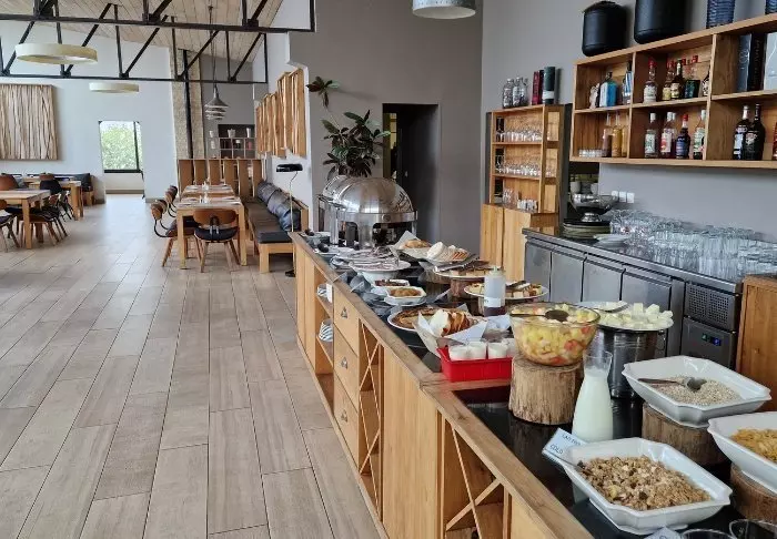 Meals are taken in the restaurant, which is almost reminiscent of a communal kitchen at a folk high school – with long tables and a lounge area where you can sit and relax and enjoy a drink before dinner.