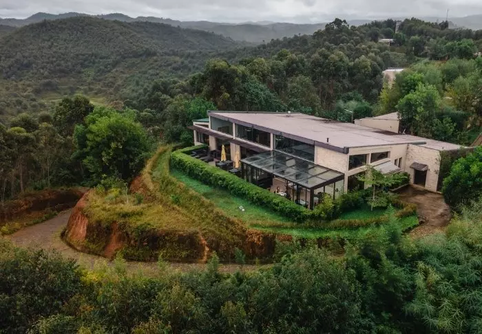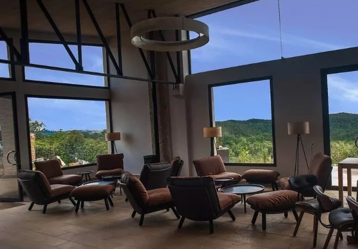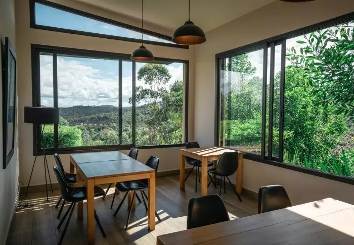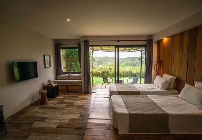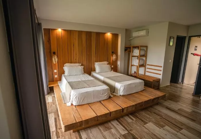 The 23 rooms are large and decorated with respect for the surrounding nature. There are wooden floors and muted colours, and from the shower you have a view of the forest around you. The bathrooms are also stocked with environmentally friendly soap and shampoo, and all surplus water is collected and filtered before it is reused to water the flowering garden outside.