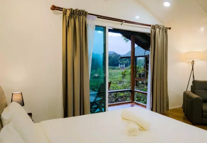 The resort’s 56 rooms are tastefully decorated, exuding classic charm with fine details and colonial-inspired wooden furniture, some adorned with Jim Thompson’s exquisite silk fabrics. The rooms offer breathtaking views through large French doors that also allow daylight to flood in. Each room is equipped with modern conveniences including Wi-Fi, a flat-screen TV, a minibar, tea and coffee-making facilities, and a fan. The bathrooms feature a bathtub and shower, along with a hairdryer, slippers, a bathrobe, and toiletries.