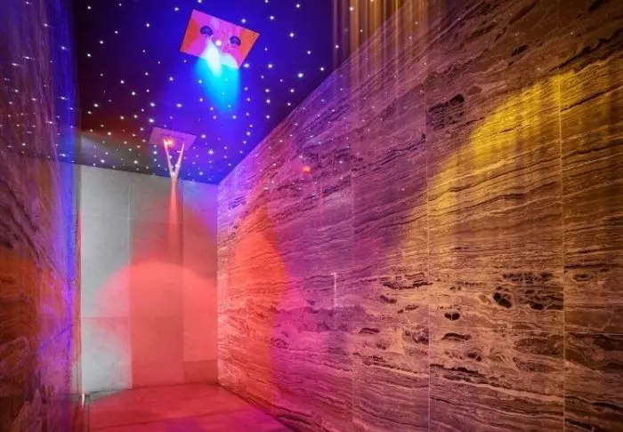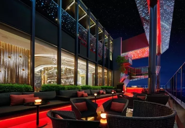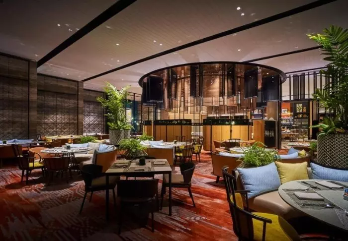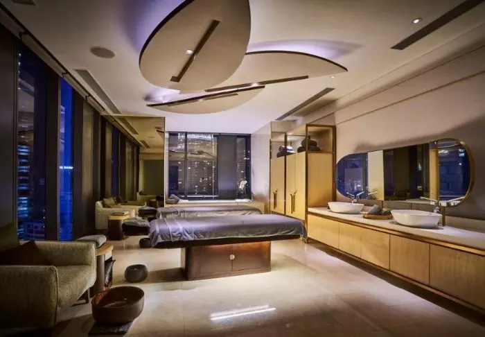 The hotel’s spacious rooms are stylishly decorated, featuring large windows that allow plenty of natural daylight in, while offering stunning views of the city’s skyline. The unique architectural design ensures that noise and heat are kept at bay. The rooms are meticulously designed in cool earthy tones and are equipped with modern amenities such as air conditioning, Wi-Fi, a flat-screen TV, a safety box, a minibar with snacks and beverages, and a spacious bathroom with a rain shower, bathtub, and toiletries.