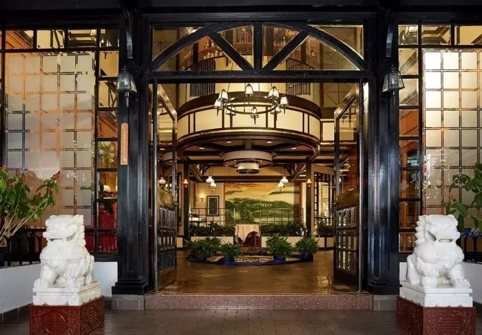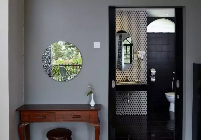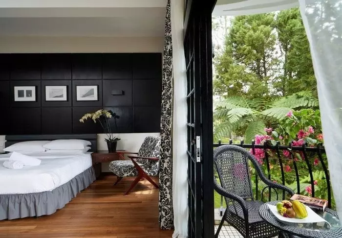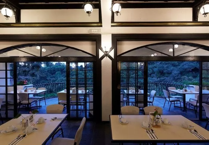 The exterior of the resort is in British colonial style with white facades, black mullioned windows, and fine balconies decorated with beautiful flowers from the area.