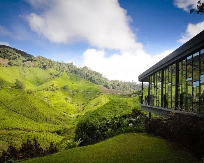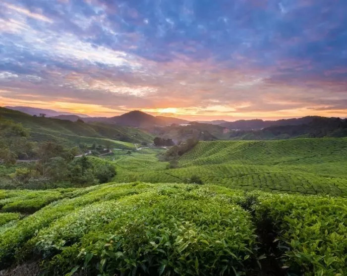 The Cameron Highlands are located 1,542 metres above sea level and offer a cooler climate compared to the rest of Malaysia. The pleasant temperatures make the land particularly fertile, which is used for cultivating strawberries, corn, orchids, roses, and tea with plantations stretching as far as the eye can see.