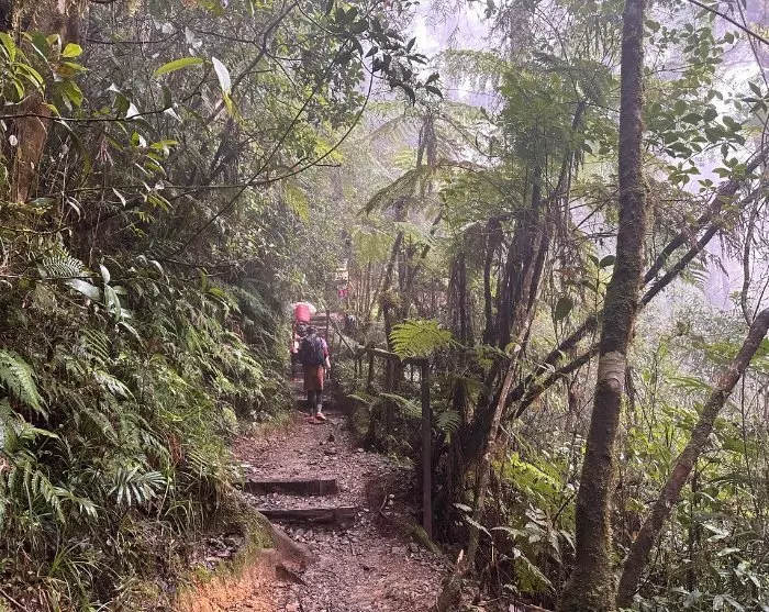 Leaving Timpohon Gate, you’ll enter the lush rainforest terrain, accompanied by the sounds of cicadas and birds. The trail winds through dense bushes and tall trees, with the humid air gradually replaced by cooler temperatures as you ascend the mountain.