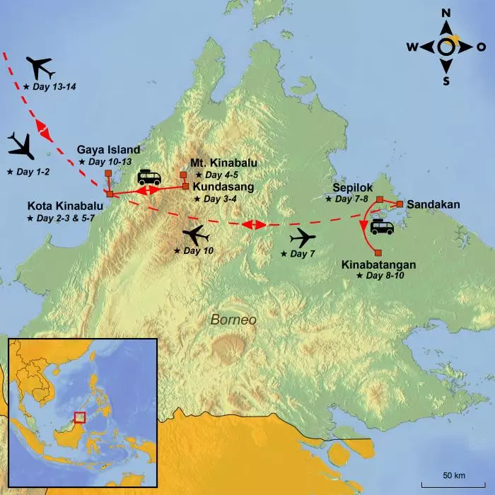 You will arrive in Kota Kinabalu on the world’s third-largest island, Borneo. The island is predominantly Indonesian in the south, while the small country of Brunei is nestled between the two Malaysian states of Sabah and Sarawak in the north, offering an abundance of spectacular natural and wildlife experiences.