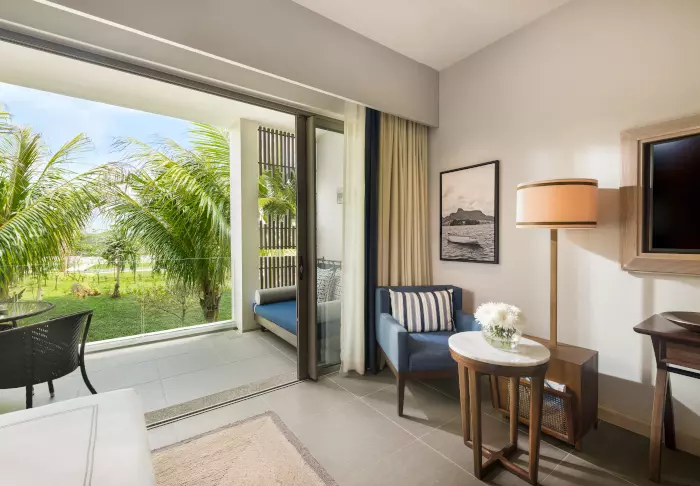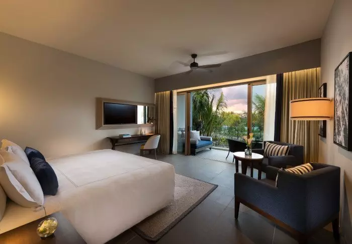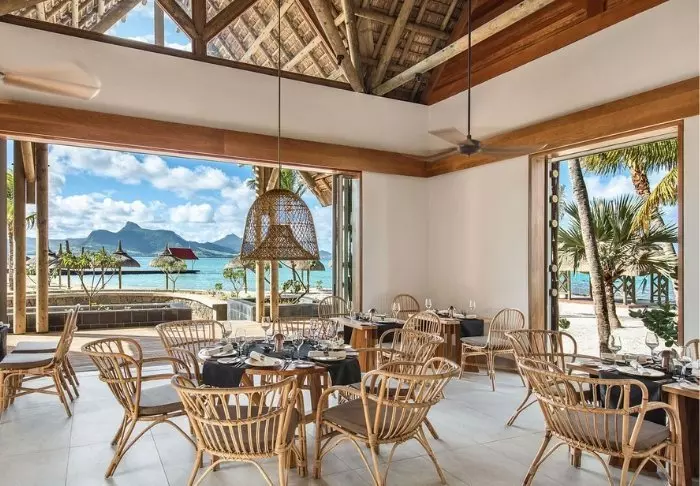 The rooms are large, spacious and decorated in Mauritian and Asian style with either a balcony or a patio. All of the rooms look out onto the sea and all have air conditioning, a minibar, tea and coffee making facilities, a flat-screen TV – and everything else you would expect from a five-star resort. There is free Wi-Fi throughout the hotel.