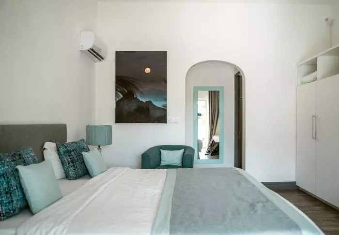 In the centre of the hotel, the pool and restaurant are nicely surrounded by tropical vegetation. The pool is not huge, but that doesn’t matter much, because at the end of the complex is the finest white beach that leads out into the turquoise sea.