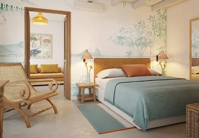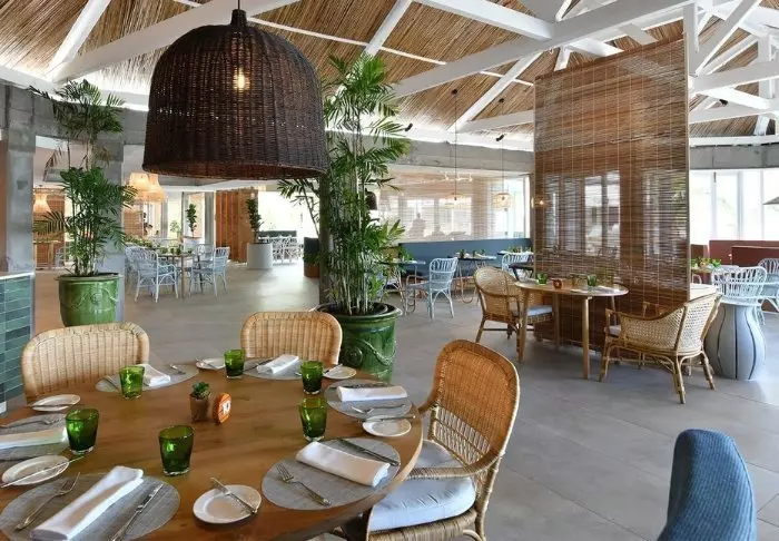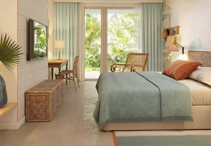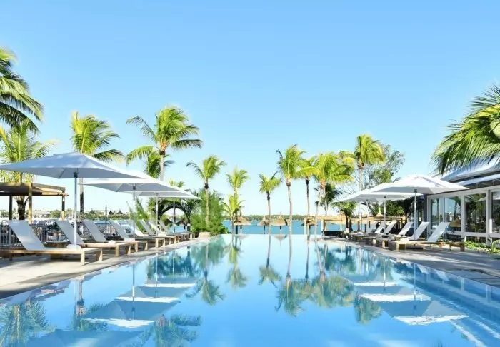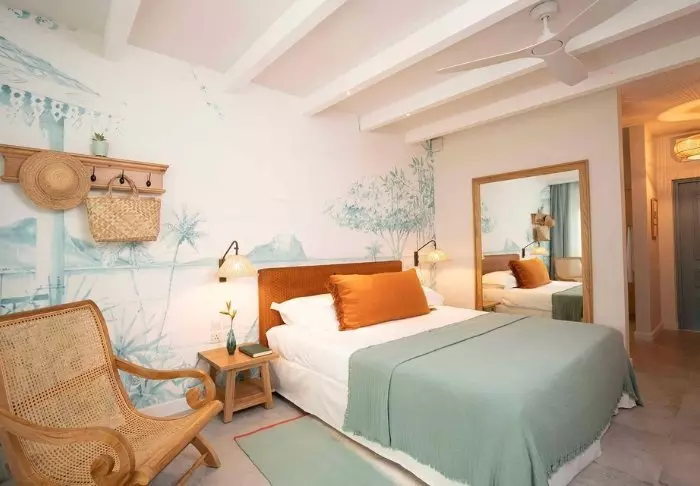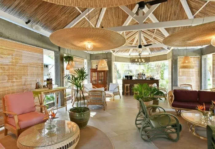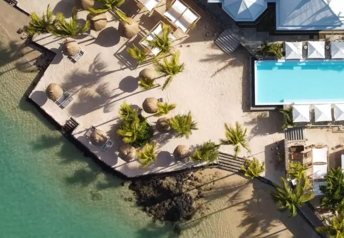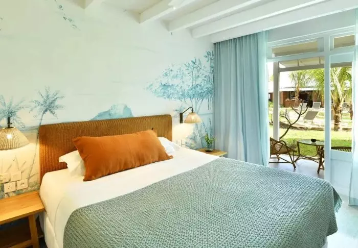 The hotel itself is very charming with its modern colonial style. Green plants, wooden shutters, bamboo furniture and pale colours characterise the interior in both the lobby and restaurant. The long infinity pool is located in the middle of the resort, while the delightful beach bar/restaurant overlooks the beach and cove. Just below the beach bar you will find the ‘boathouse’, where you can borrow kayaks or paddleboards. It is also from here that you can hop on the free water taxi that will take you into the centre of Grand Baie. With your stomachs – or shopping bags – full, you can easily stroll back to the hotel in less than 15 minutes.