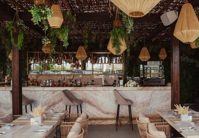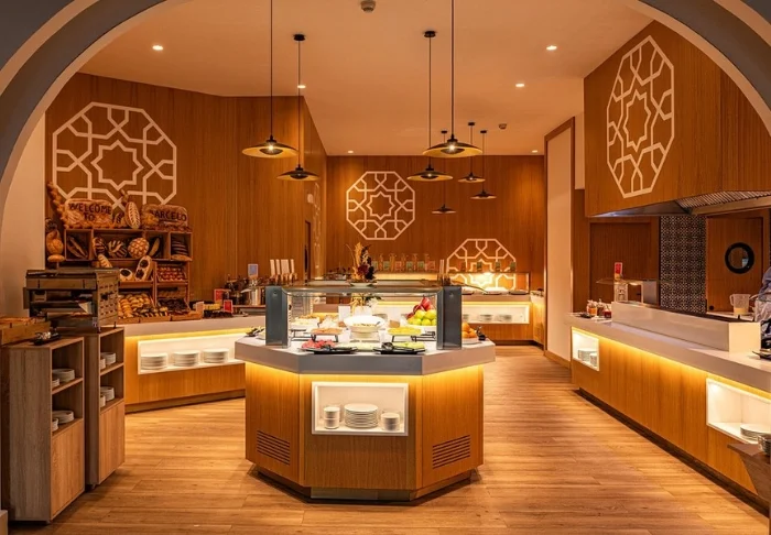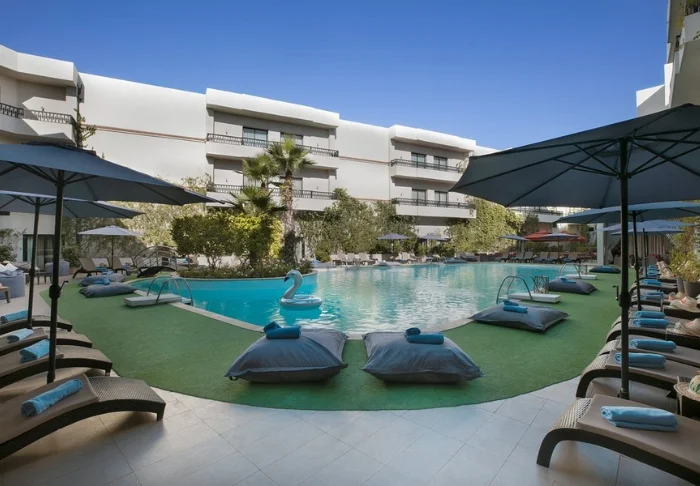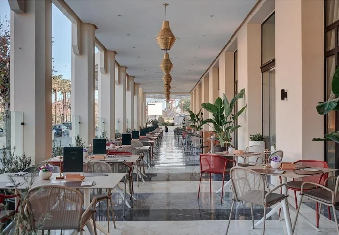 Breakfast is often served by the hotel’s pool, which sits at the heart of the complex and serves as a natural gathering point, or indoors in the restaurant. Throughout the day, the pool bar offers drinks and light snacks, and there’s also a dedicated bar next to the hotel lobby.