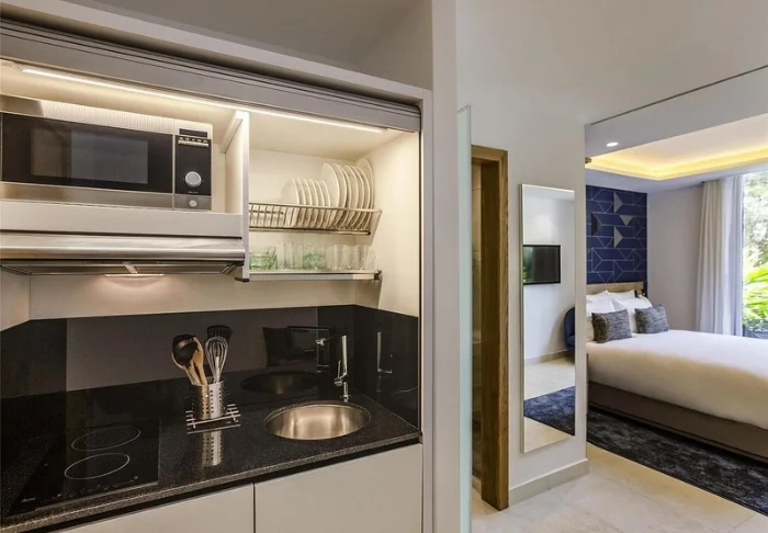 The hotel offers 96 tastefully furnished apartments and studios, each equipped with its own kitchenette featuring hobs, a microwave, and a mini fridge. Every room also comes with air conditioning and complimentary Wi-Fi.