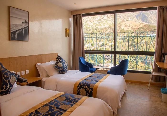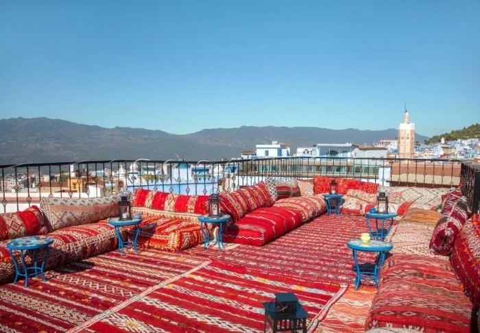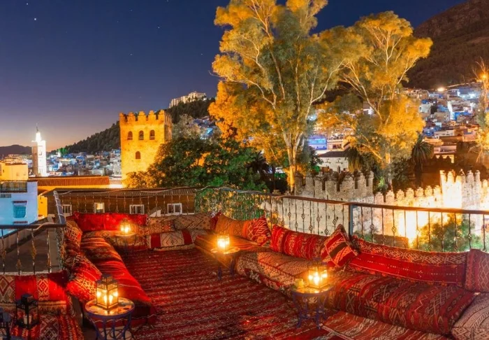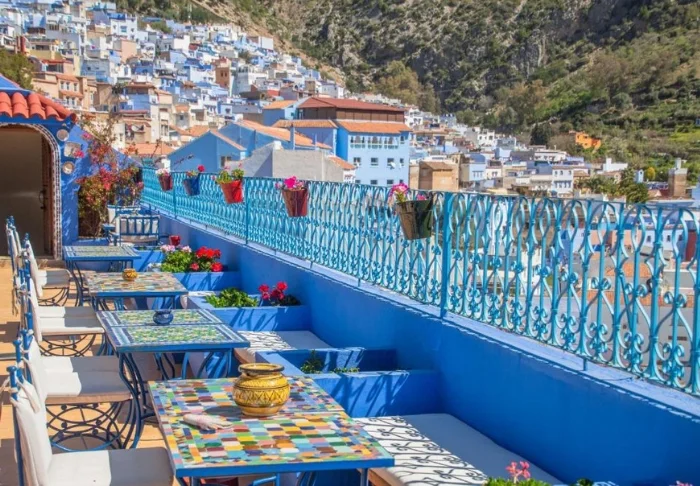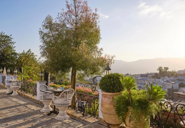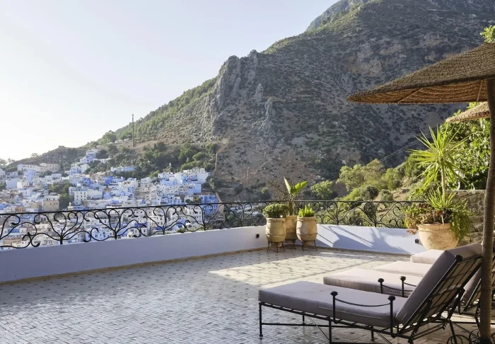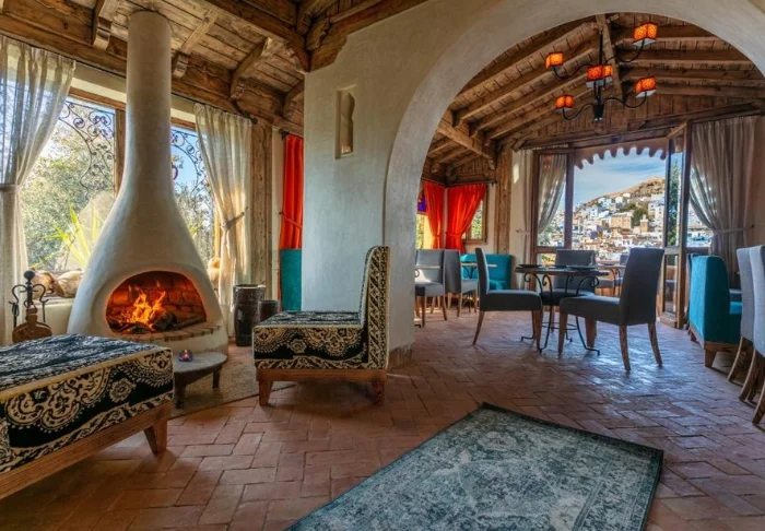 The hotel’s restaurant serves classic Moroccan dishes – tajine, couscous, and freshly baked bread – often enjoyed al fresco as evening descends over Chefchaouen.