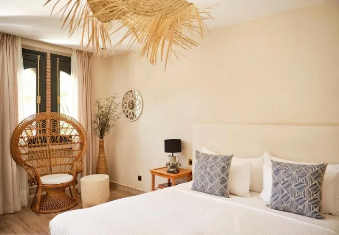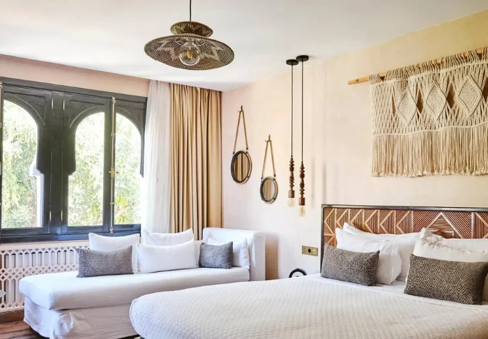 The hotel features 85 rooms, each tastefully decorated in an art deco style with a playful Moroccan twist. Every room is equipped with air conditioning, a mini fridge, a flat-screen TV, and complimentary Wi-Fi. A unique perk in Marrakech, every room here also has its own private balcony.