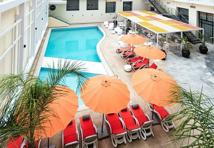 The swimming pool beckons for a refreshing dip before you settle down for dinner in the hotel’s restaurant.