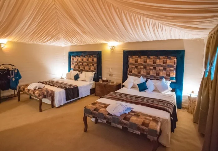 You’ll stay in a luxurious tent with an en suite bathroom with a shower and toilet. The tents have air conditioning and, depending on the season, heating, so your comfort is assured even though desert temperatures can fluctuate considerably.