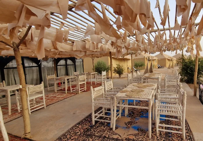 From your private terrace you can look out over the famous dunes of Erg Chebbi. Towards the end of the day, as the sun sinks behind the sands, a unique atmosphere descends, and every sound seems to hush in the fading light.