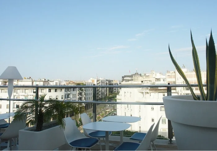 On the ground floor, you’ll find the hotel’s restaurant and café area, where a varied breakfast buffet is served. Up on the rooftop terrace, you can enjoy a drink and take in views of Casablanca’s city life from above.
