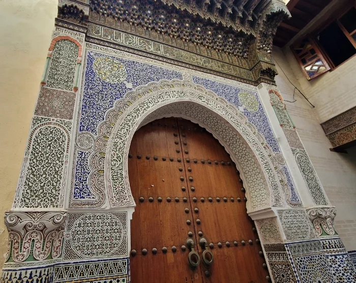 Another highlight in Fes is the royal palace just outside the medina. Although you can’t go inside, every visitor is struck by the magnificent golden gates, framed by turquoise mosaics. The seven gates represent the seven heavens in Islam, a testament to the historic and continued significance of the monarchy. Just behind the palace lies the old Jewish quarter, the Mellah, where its distinctive architecture tells the story of Fes’ rich cultural diversity and centuries of peaceful coexistence.