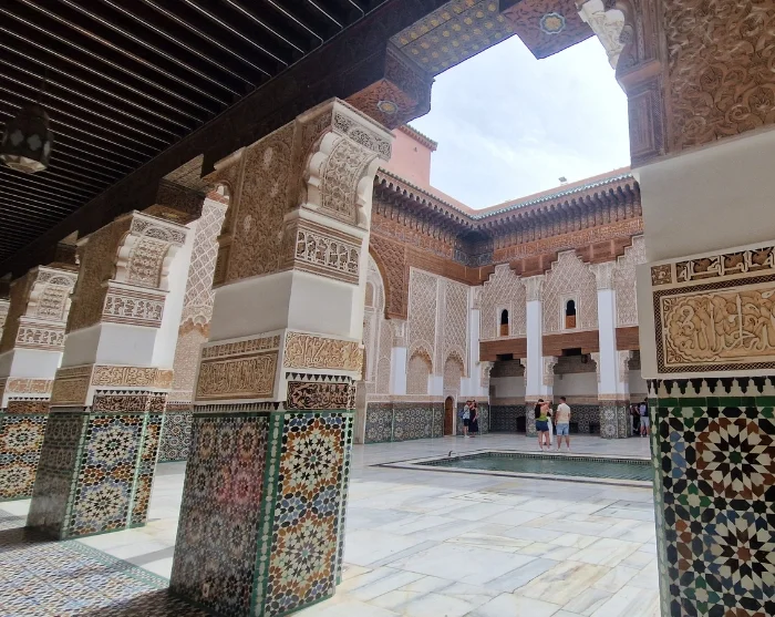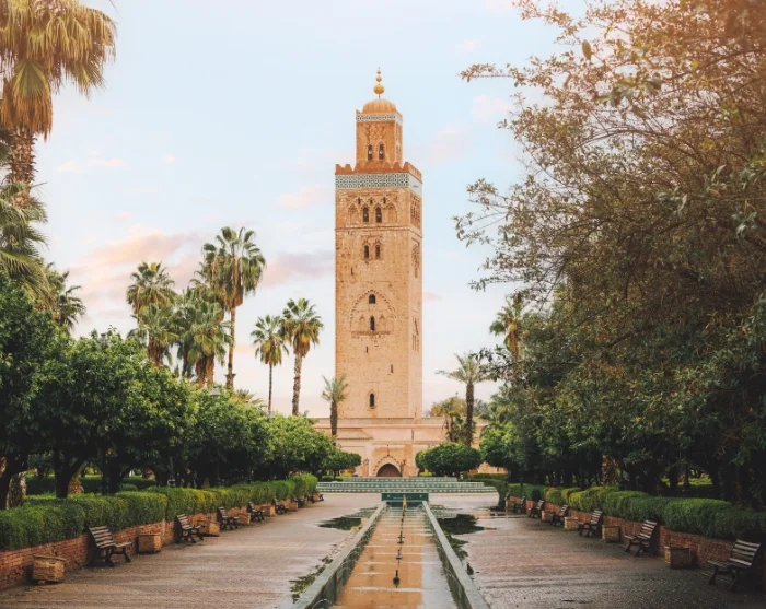 The medina is the historic heart of the city. Here you’ll find the old mosques and madrasas, the artisans’ workshops, and bustling marketplaces. The streets are narrow and labyrinthine—a design said to have allowed residents to hide from invaders, who would inevitably lose their way unless they were true locals. But you’re in safe hands: your guide knows the medina like the back of their hand and will expertly lead you through even its most winding alleys. Your guide will often ask if you have any special interests so they can tailor the route to suit you. We highly recommend a visit to the Ben Youssef Madrasa, whose harmonious, symmetrical design, and exquisite decoration make it a true architectural gem. Don’t miss the main square, Jemaa el-Fna, either. It may seem a little subdued by day, but it’s worth knowing its location, as by evening it transforms into a scene straight out of an Indiana Jones film—with real snake charmers, food stalls lined up alongside henna tattooists, and fresh juice bars. The city’s most iconic landmark is the Koutoubia Minaret—the tallest building in Marrakech.