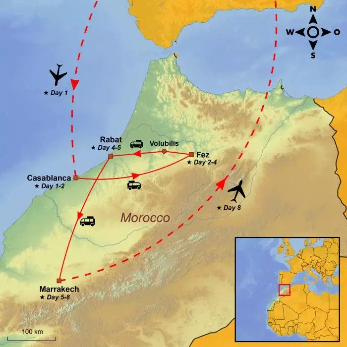 Upon arrival in Morocco, you’ll be met at the airport by our local partner and transferred to your hotel.