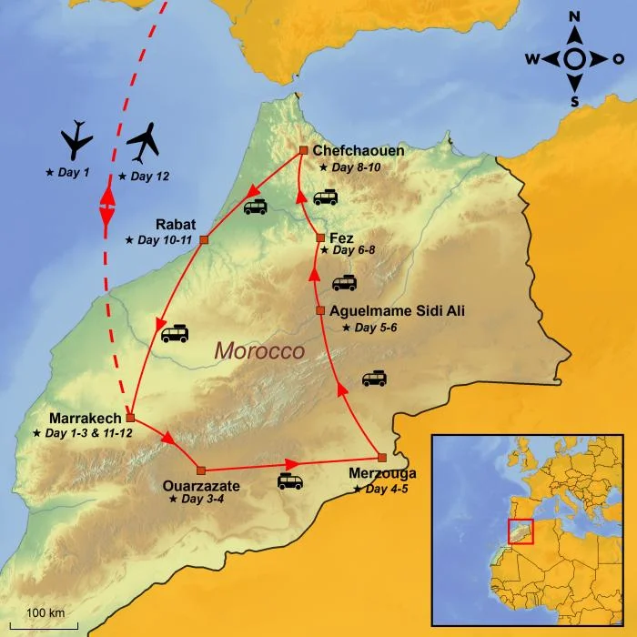 Join us for an adventure-filled tour through Morocco, exploring the bustling, colourful medinas of imperial cities, venturing across the golden dunes of the Sahara Desert, and wandering the iconic blue streets of Chefchaouen.