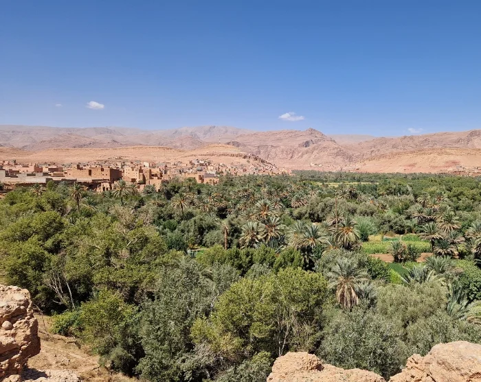 From here, you’ll continue your journey through a captivating landscape of rugged rocks and imposing stone formations. Then, all at once, the scenery transforms: an oasis springs to life amid the arid wilderness. On the valley floor, lush palms, fertile patches of farmland, and irrigation channels spread out before your eyes. The first oasis you’ll encounter is Skoura, where ancient kasbahs and earthen houses are scattered between towering palm trees.