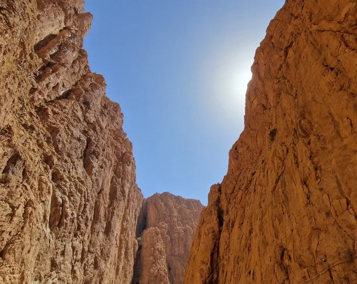 As you approach Tinghir, the valley narrows and the river nearly disappears between the steep rocky cliffs. Here, the Todra Gorge unfolds and the road hugs the narrow valley floor, where sunlight only reaches the ground for a couple of hours each day. You’ll leave your vehicle and walk the final stretch right into the heart of the gorge. The clear river runs alongside the road, and on a warm day, it’s temptingly refreshing to dip your toes in the water.