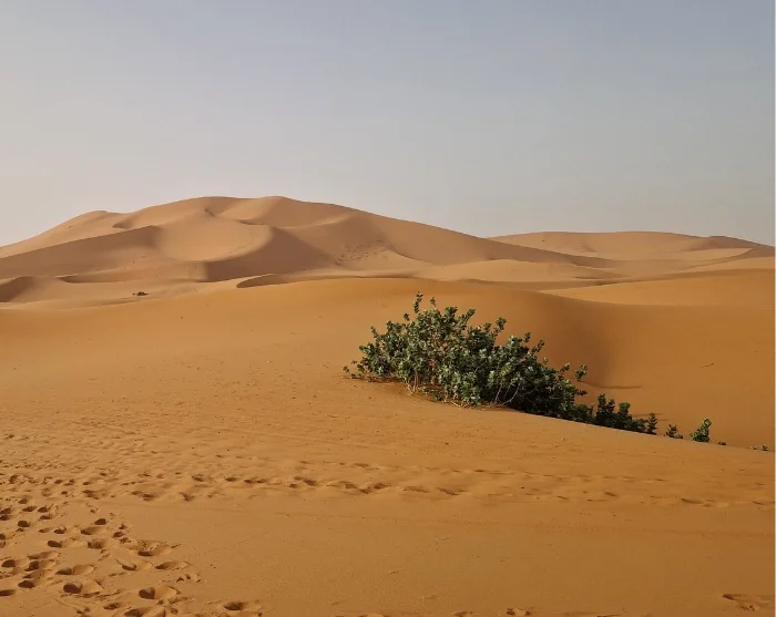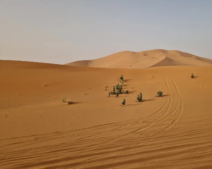 The closer you get to Merzouga, the more the desert comes into its own. Palm trees and oases vanish, replaced by sand dunes rising on the horizon. Eventually, the great Erg Chebbi dunes stand before you: towering, rolling mountains of sand glowing in the sunset, instantly recognisable by their deep orange hues and gentle curves.