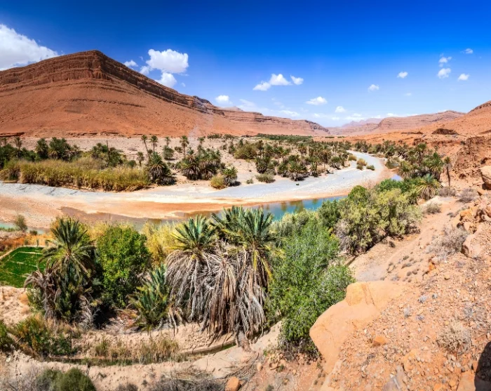 Further east, the valley floor widens and the lush vegetation begins to thin out. Here, you will truly start to feel the Sahara Desert taking hold. Sand becomes a defining feature of the landscape, and this area is famed for its fossils and traditional stone buildings.