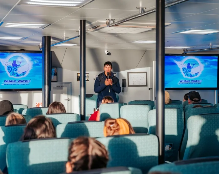 After parking your car and checking in at Whale Watch Kaikoura (at least 30 minutes before departure), you’ll be taken by bus to South Bay Marina (around a 10 minute drive), where you’ll board a modern catamaran specifically designed for whale watching. The captain and crew will be waiting to ensure you have the very best chance of spotting whales and other marine creatures and seabirds.