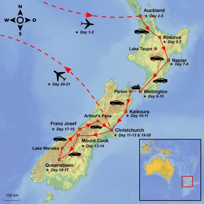 You’ll then continue through Mackenzie Country to Aoraki/Mount Cook National Park, where New Zealand’s highest mountain, Aoraki/Mt. Cook at 3,724 metres, towers above the dramatic landscape of lakes, valleys, and snow-capped peaks.