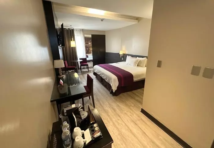 The hotel’s rooms are simply appointed and all have an en suite bathroom with complimentary toiletries and a hair dryer. The rooms also offer a safe, air conditioning, a coffee machine, Wi-Fi and a TV.