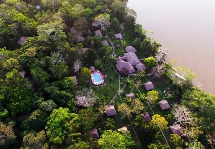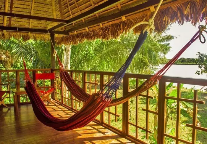 The lodge has 27 comfortable bungalows as well as a “Casa Grande” with 4 separate rooms. All are built in wood and simply appointed, but all have a bed with a mosquito net, an en suite bathroom with hot water, a safe and a private terrace with hammocks, where you can lie and listen to the trickling of the river and the exotic sounds of the jungle.